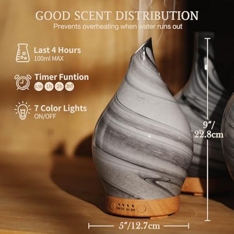 - UNIQUE ART DECORATIVE DESIGN – Our 100ml glass essential oil diffuser has an elegant starry pattern glass cover and wood grain decorative base. It is very suitable for your bedroom, living room, children’s room, study room, office, and yoga room.