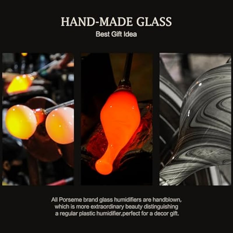 - HANDMADE GLASS DIFFUSER – Our Porseme 100ml aroma diffusers are 5” in diameter and 9” in height. They are handblown glass so each glass globe is unique. 100ml essential oil diffuser lasts for 4 hours and has a good output of mist. Fits a room not larger than 15*15(ft). You can place in any area and relax.