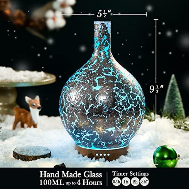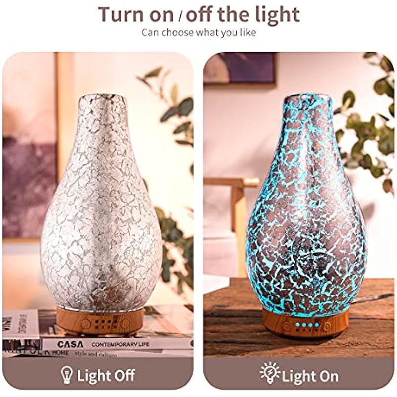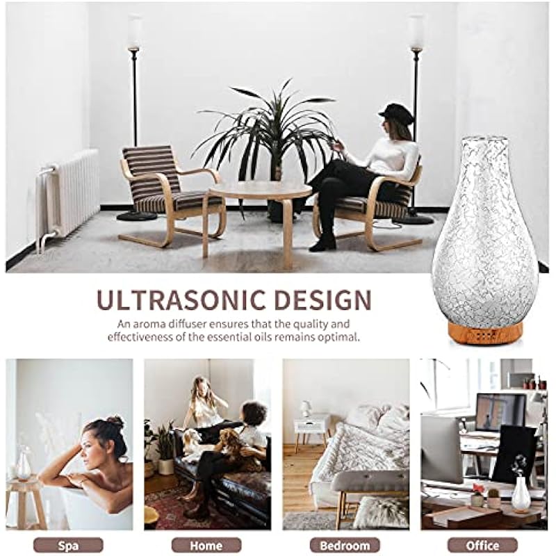 - UNIQUE ART DECORATIVE DESIGN – Our 100ml glass essential oil diffuser has a silver plated effect glass cover and wood grain decorative base. It is very suitable for your bedroom, living room, children’s room, study room, office, and yoga room.