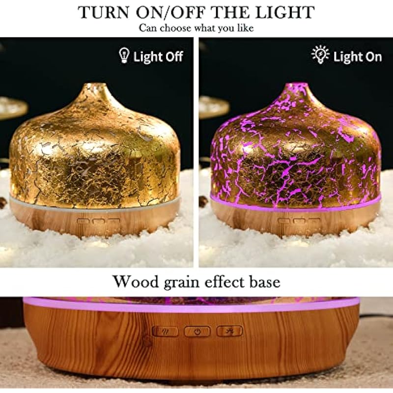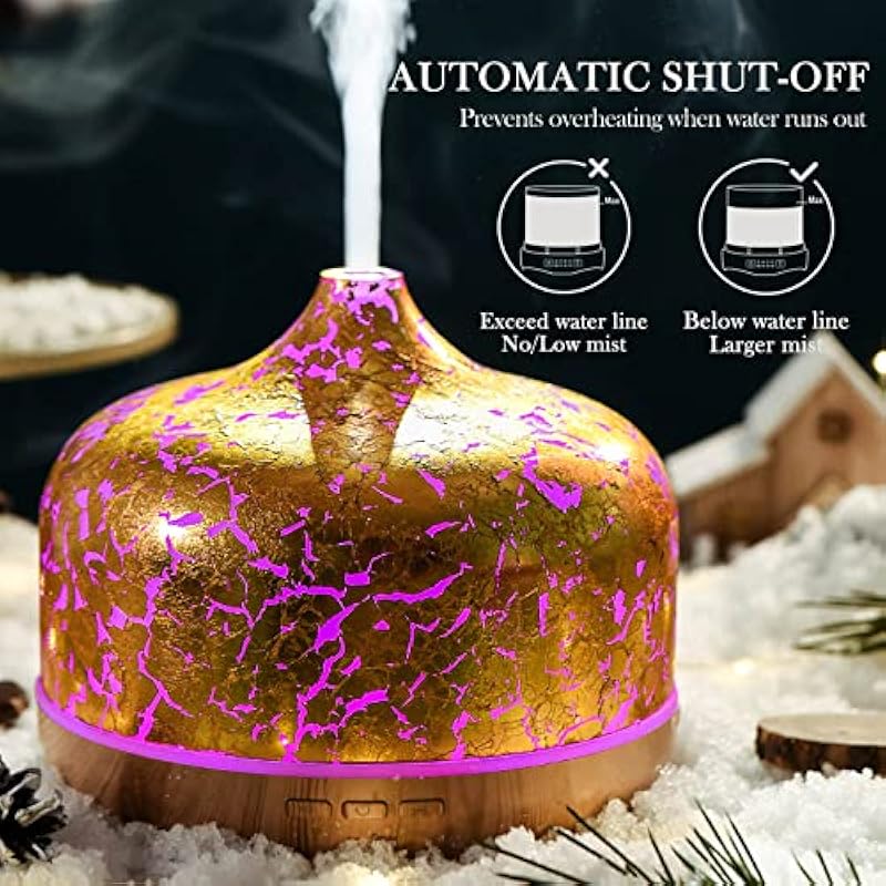 - UNIQUE ART DECORATIVE DESIGN – Our 500ml glass essential oil diffuser has an elegant gold plated glass cover and wood grain decorative base. It is very suitable for your bedroom, living room, children’s room, study room, office and yoga room.