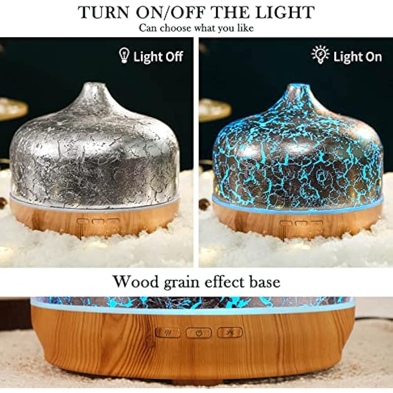 - UNIQUE ART DECORATIVE DESIGN – Our 500ml glass essential oil diffuser has an elegant sliver plated glass cover and wood grain decorative base. It is very suitable for your bedroom, living room, children’s room, study room, office and yoga room.