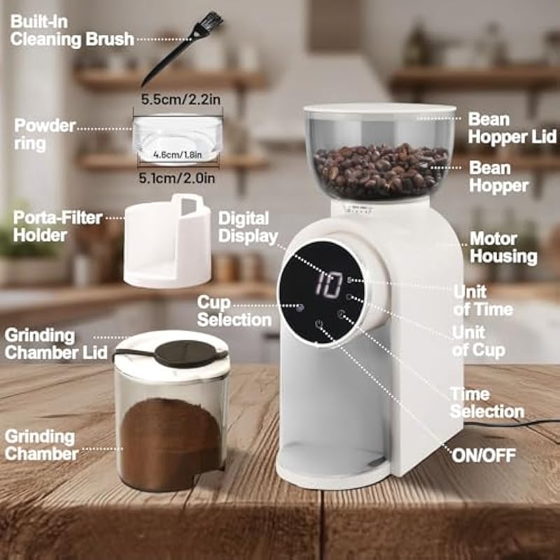 - Easy to Clean and Maintain:Our electric coffee grinder is designed for easy cleaning. Removable Bean Hopper, upper burr, and cleaning brush included (under Bean Hopper Lid) for effortless cleaning.The Porta – Filter Holder and Grinding Chamber can be easily removed, and you can use the included cleaning brush to get rid of any coffee residue quickly. This ensures that your grinder is always in top – notch condition, ready to produce fresh and delicious coffee whenever you want