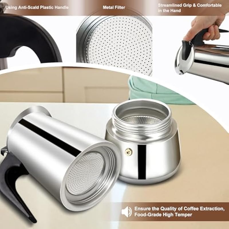 - Stainless Steel Design: The Espresso coffee maker body is polished and designed with smooth stainless steel, with three-ring precision threads, equipped with a high-performance pressure-resistant safety valve, double safety guarantee design, effectively preventing over-pressure situations. The frosted coating inside the moka pot is not made of aluminum, but is treated with a fine sandblasting process, further enhancing the overall texture and durability