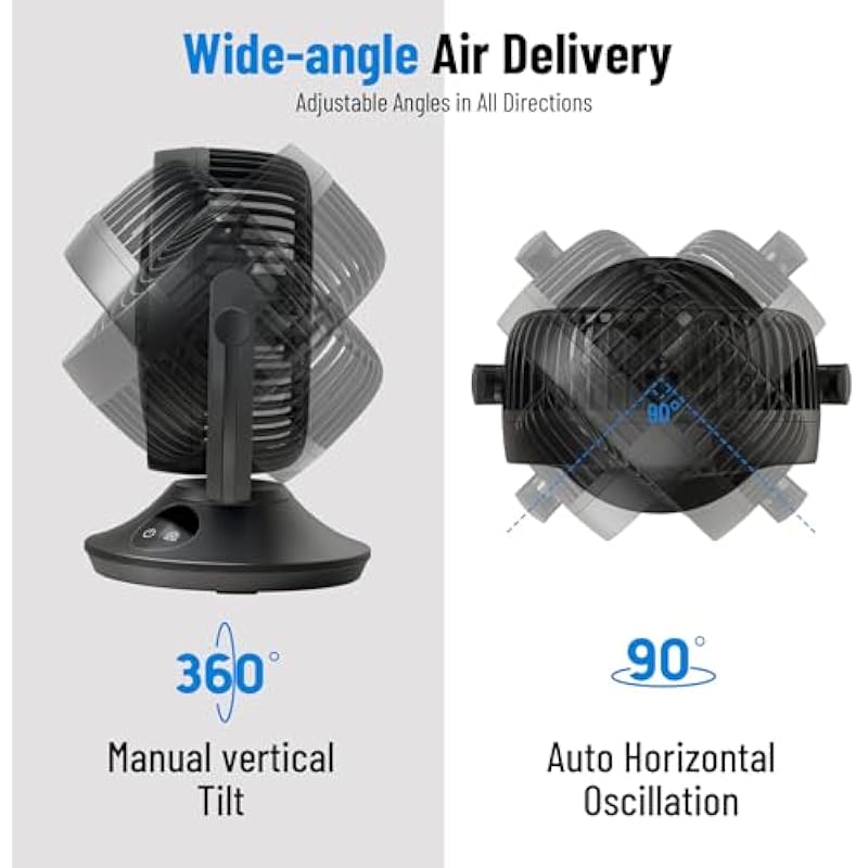 - 【Flexible Adjustment Oscillating Fan】: The cooling fan can auto oscillate 90° horizontally and manually adjust 360°vertically, covering a wider range and ensuring even airflow throughout the room. Whether in the kitchen, bedroom, or living room, this oscillating fan is the perfect companion for those hot summer days.