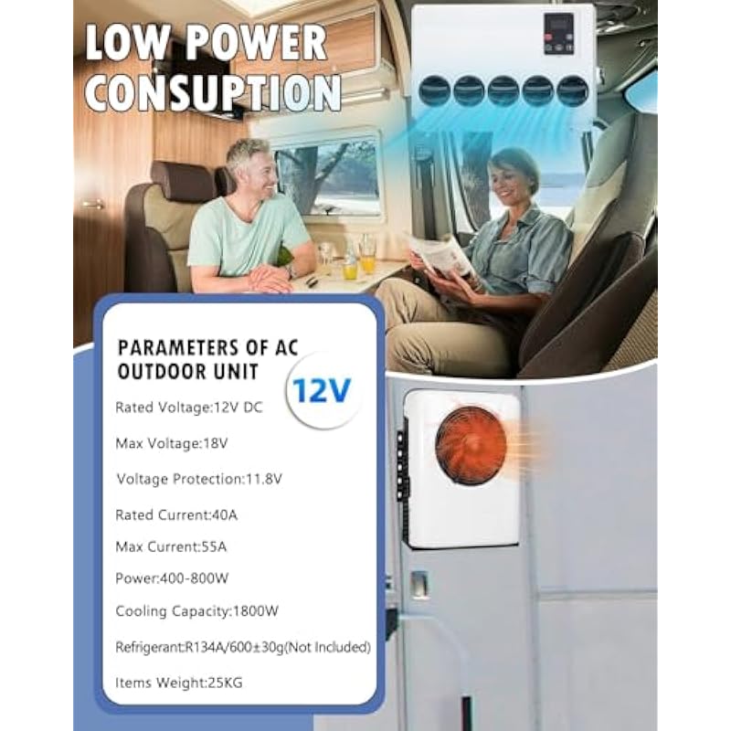 - Safe and Worry-free Use: 12V DC Power Supply with Low Voltage Protection – This 12-volt air conditioner is designed to automatically shut off to prevent the battery from being completely drained, ensuring that your car will start normally. It also features over-voltage and over-current protection.