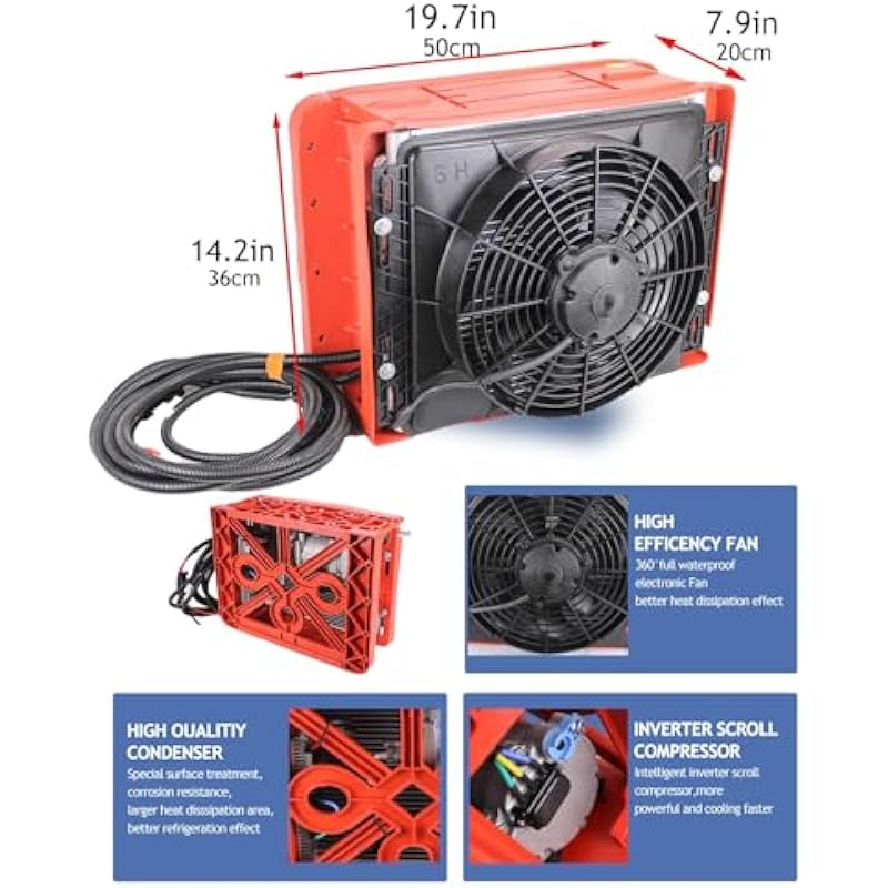 - 【12V Split Air Conditioner Fast Cooling】 Our 12V air conditioners are build with high quality aluminum condenser, and high-efficiency inverter scroll compressor. Cooling capacity 1800W, large air volume of 250-450m³/h, and pure copper wire motor power 400-800W.