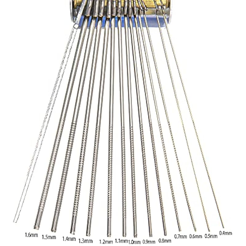 - The guitar nut and bridge file set with 13 round files and 1 flat file.