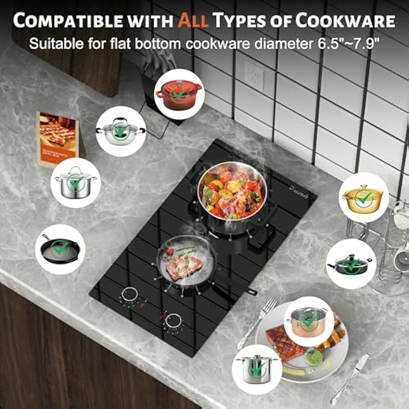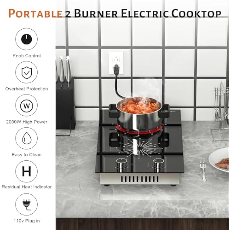 - 🥘【Dual Efficient Cooking Zones】Disaenvir 2 burner electric cooktop is designed with double heating zones(1600W + 400W), allowing you to cook with two pans or pots in different sizes. The heating speed of the large burner will be faster, while the small burner is generally suitable for insulation.