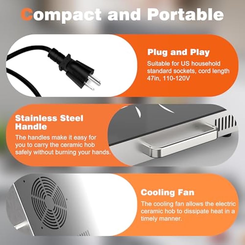- 🍳【Compatible for All Types of Pans】Cooksir 120v electric stove top with plug is suitable for any material of cookwares, such as aluminium pans, copper pans, cast iron frying pans and non-magnetic stainless steel pans. Please make sure that the bottom of the pans used should be flat with diameter from 4.72″ to 9.45″. Product Size: 22.2″ L x 13.1″W x 1.97“H.