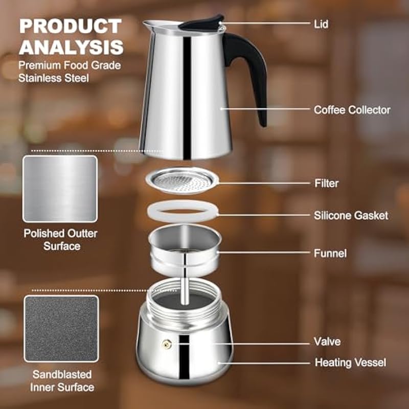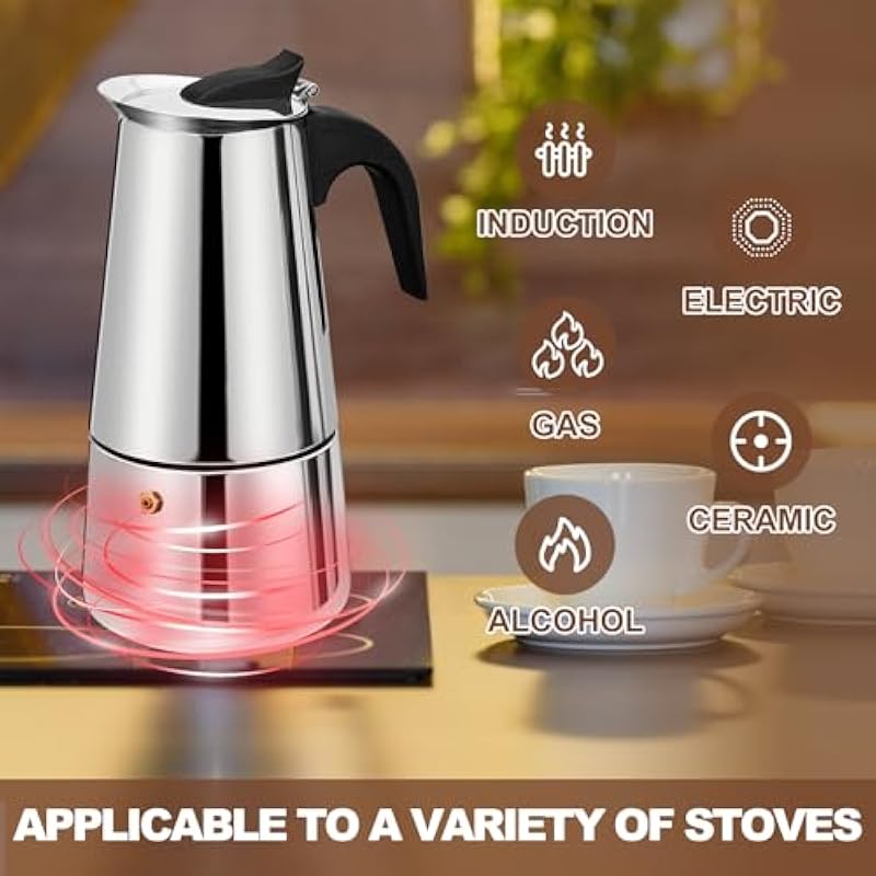 - Capacity: Standard espresso coffee cup is 50 ml. 2 Cup/3.3 oz/100 ml;4 Cup/6.6 oz/200 ml;6 Cup/10 oz/300 ml; 9 Cup/15 oz/450 ml; 12 Cup/20 oz/600 ml. Mocha Coffee Maker with strong aroma can make delicious espresso for you in 5 minutes, you will be impressed by its rich flavor and aroma immediately. Induction heat guide plate is designed for various flat-bottomed cookware. The diameter is 16cm/6.3in,thickness is 0.34 cm/0.13 in