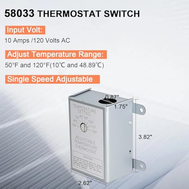 - ► Parameter of 58033 Thermostat – Input Volt: 10 Amps / 120 Volts AC, Diameter of Mounting Holes: 0.87”, Box Size: 3.82”L x 2.62” W x 1.75” H, Single Speed Adjustable. Caution: Automatically started device – to reduce the risk of injury disconnect from the power supply before servicing. For residential use only.
