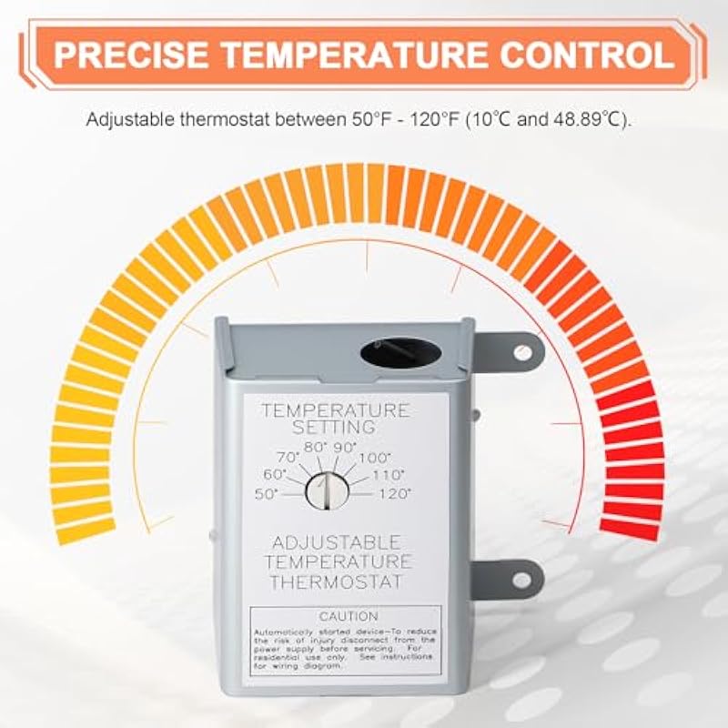 - ► Precise Temperature Control – Adjustable thermostat switch between 50°F and 120°F (10℃ and 48.89℃). You can easily set your desired activation temperature anywhere between 50°F and 120°F. The thermostat seamlessly activates your attic fan when temperatures rise above your set point and deactivates it once the temperature drops, ensuring optimal attic ventilation without manual intervention.