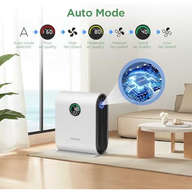 - PM2.5 Air Quality Display & Auto Mode: Embark on pure, effortless air with our air purifier’s Auto Mode. This advanced Sensor detects the PM2.5 levels in real-time, dynamically tuning the fan speed to ensure unwavering purification. Plus, the three-color indicator light provides instant feedback on the cleanliness of your indoor air, let you know the health of the air at any time.