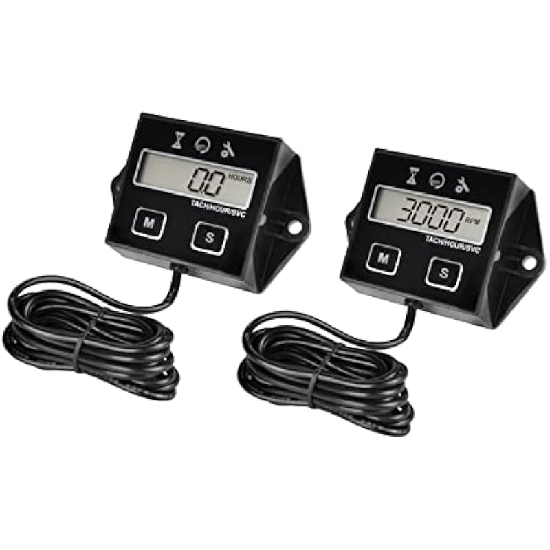 - PACKAGE CONTENTS —- 2 pieces hour meters, 1 large box containing 2 individually packaged hour meters, solving the need for maintenance of more than one engine.HM001E includes tachometer, hour meter, service timer functions.