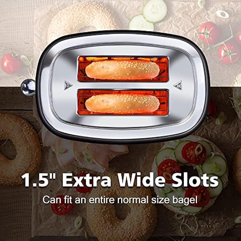 Long Slot Toaster 2 Slice,Cancel Reheat Defrost Functions,Removable Crumb Tray,6 Browning Settings,Extra Wide Long Slots,Stainless Steel,Black