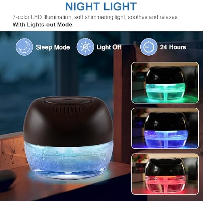 - 【High Effective Air Purifier】: With night light design, 7 colors changing mood lights, 1st press, power on, 7 led light on, irregular changes. 2nd press, led light off, operating quietly less than 30dB. 3rd press, shut off