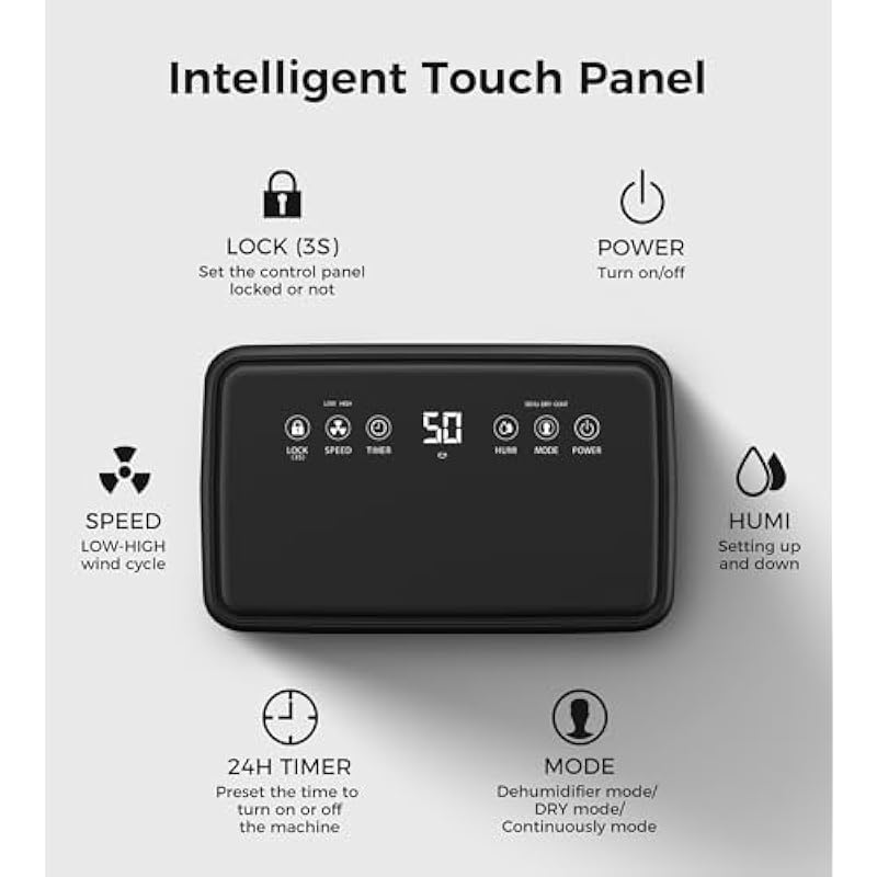 - Intelligent Control for Personalized Comfort – The dehumidifier for bathroom boasts an advanced control system with child lock, variable fan speeds, custom humidity settings, 3 versatile modes (DEHU, DRY, CONT), and a 24-hour timer. The child lock ensures safety, while adjustable fan speeds enhance airflow and drying efficiency. Monitor and fine-tune humidity levels with the real-time display for optimal comfort. The 24-hour timer allows preset operation, maximizing energy savings and convenience