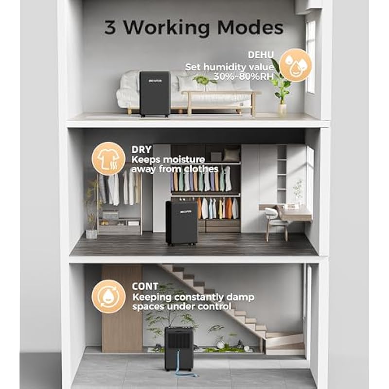 - Three Intelligent Modes for Customized Comfort – The basement dehumidifier features 3 smart modes: DEHU for automatic humidity control, DRY for efficient clothes drying, and CONT for continuous moisture removal. In DEHU mode, it auto-adjusts to maintain your desired humidity level. DRY mode optimizes fan speed to quickly dry laundry, while CONT mode reduces humidity to the lowest levels. With these versatile functions, it effortlessly addresses diverse needs, ensuring comfort in basements, homes, and more
