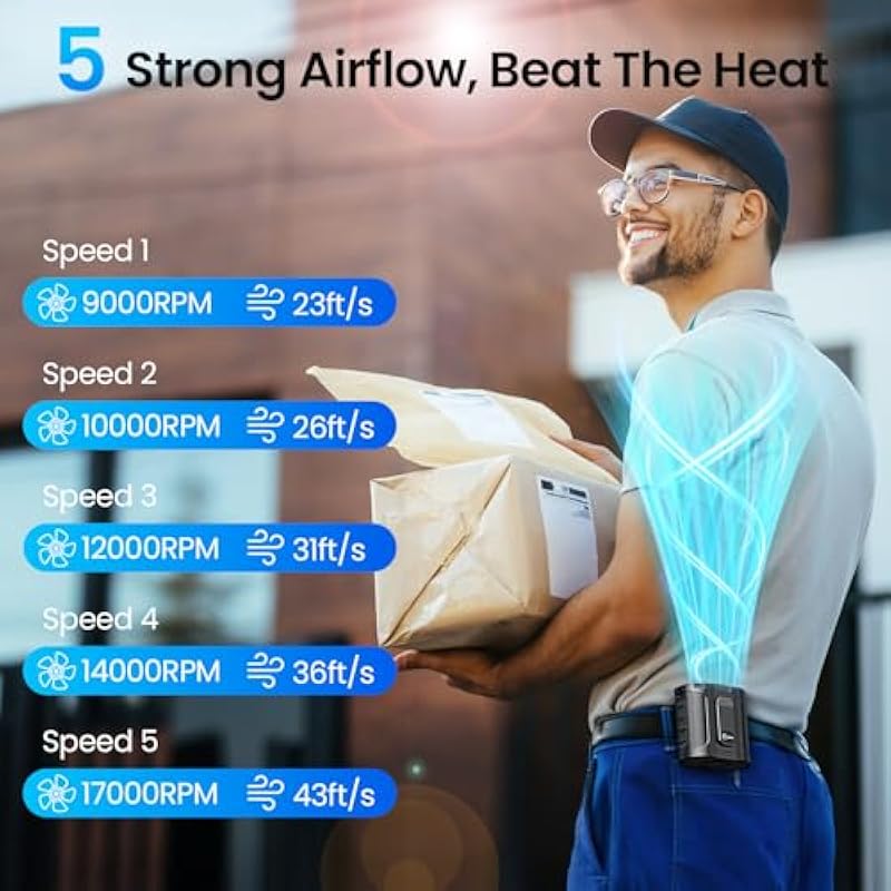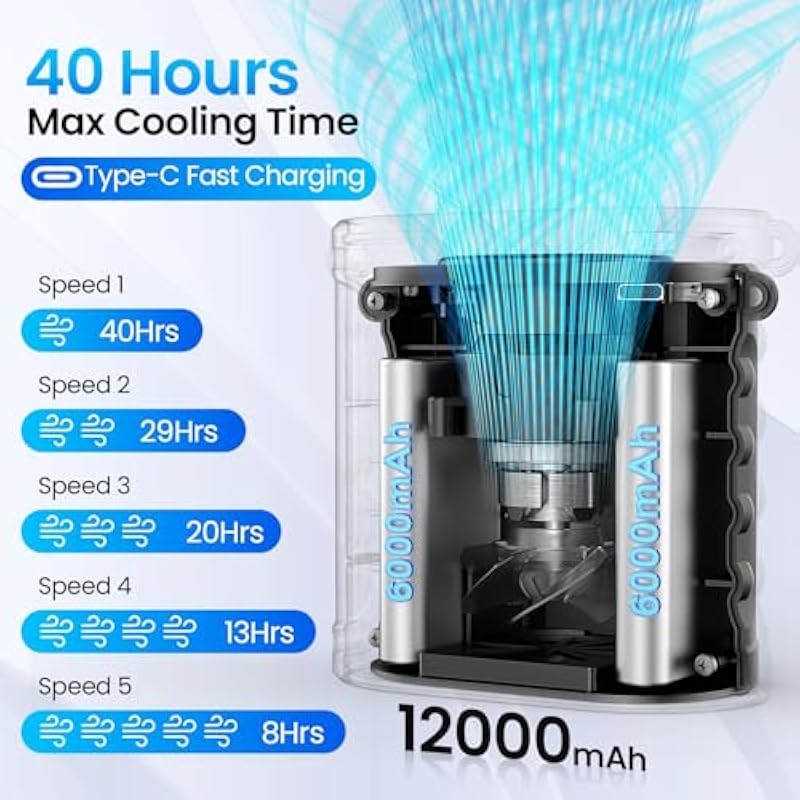 - 【Super Long Runtime】Built with a massive 12,000mAh rechargeable battery, our belt clip fan delivers up to 40 hours of continuous cooling on a single charge. Whether you’re working outdoors or on a long trip, you can stay cool all day without worrying about constantly recharging.