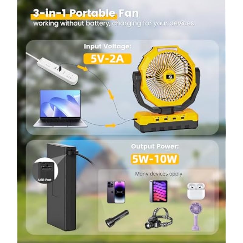 - 𝟯-𝗶𝗻-𝟭 Rechargeable Fan: Equipped with cutting-edge fast charging technology, our rechargeable fan boasts a quick and efficient battery recharge, keeping you cool seamlessly, indoors or out. Its rechargeable battery offers a consistent, 4 levels wind speeds, seamlessly transitioning to AC power for effortless indoor use.