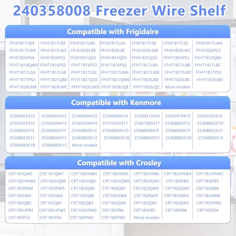- Part Number: part number 240358008 Freezer Shelf ensures compatibility with multiple models, replacing 240358002, 240358005, 3016195, AP5803890, and PS8769003.