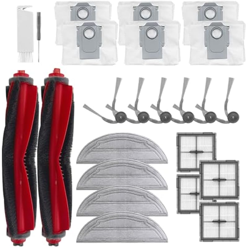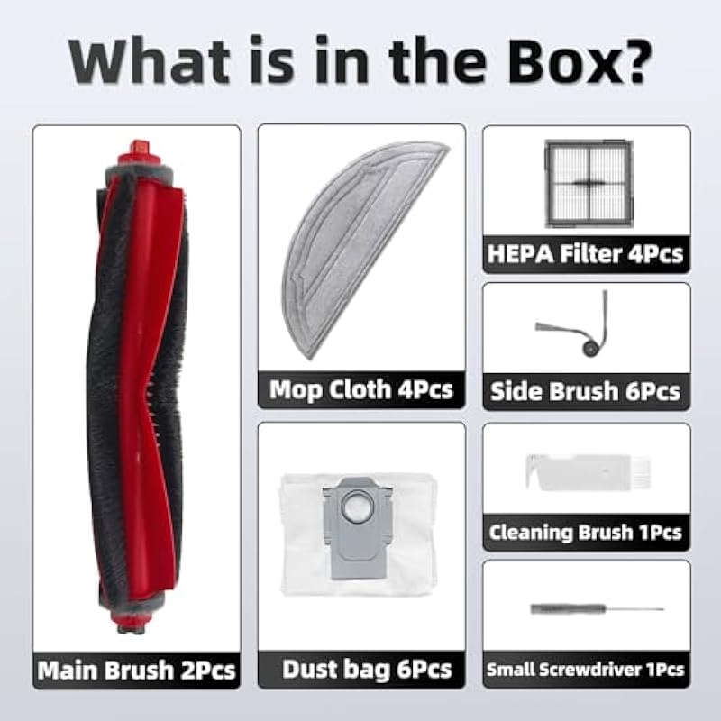 - 【Replacement Parts】: 2 Rubber Main Brush, 4 Mop Cloth Pads, 6 Vacuum Bags, 6 Side Brushes, 4 Filters, 1 Cleaning Brush, 1 Screwdriver. These replacement parts can seamlessly snaps in and out of place quickly and effortlessly, Completely compatible with your robot,keeps your home robot vacuum at optimal performance.