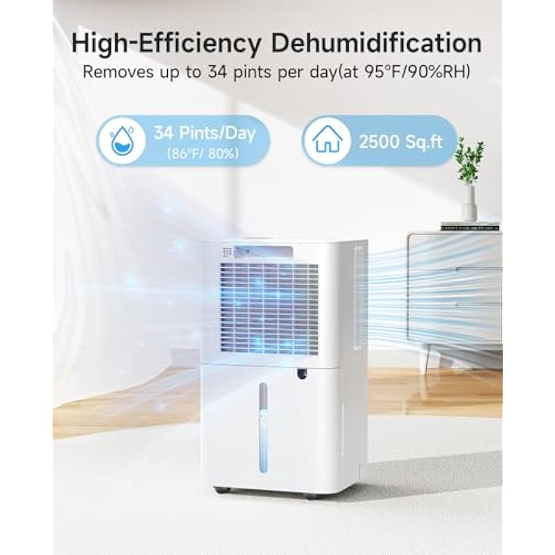 - 2500 Sq.Ft Coverage | 34 Pints/Day Capacity — Our Cagstul dehumidifier tackles moisture effortlessly in spaces up to 2500 sq ft, ideal for basements, garages, and large rooms. With 34 pints/day extraction (95°F/90%RH), it maintains optimal 30%-80% humidity levels using smart sensors. Protect your bedrooms, bathrooms, and storage spaces from excess moisture, and enjoy a fresh, breathable environment throughout your home