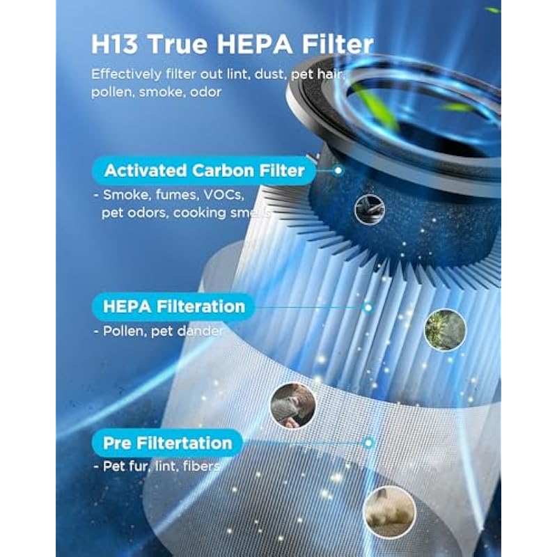 - [H13 High-Performance Filtration] The air purifier for home pets uses a true H13 HEPA filter with a 3-stage purification system – pre-filter, H13 and high-efficiency activated carbon filter, which effectively captures pet hair, dander, dust, pollen, smoke and other large particles, alleviate discomfort caused by air pollutants and provide you with a clean and healthy air environment.