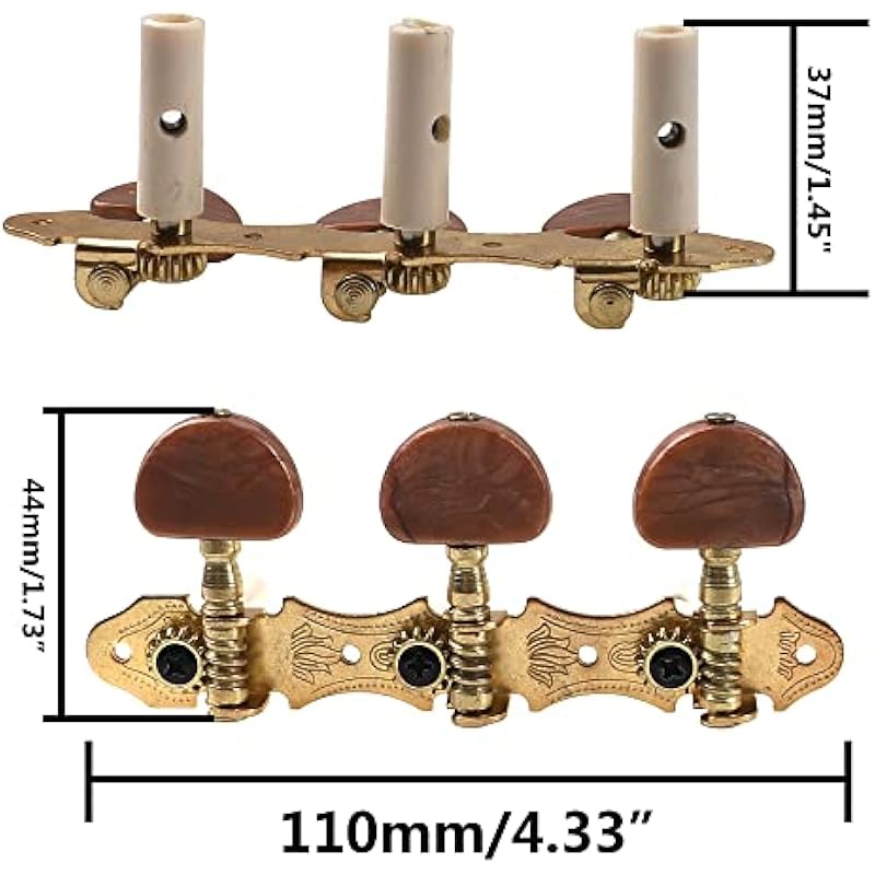 - Size: 110 x 44 x 37mm/4.33 x 1.73 x 1.45″. Package includes: 1pcs left guitar tuner peg, 1pcs right guitar tuner peg, 8pcs screws.