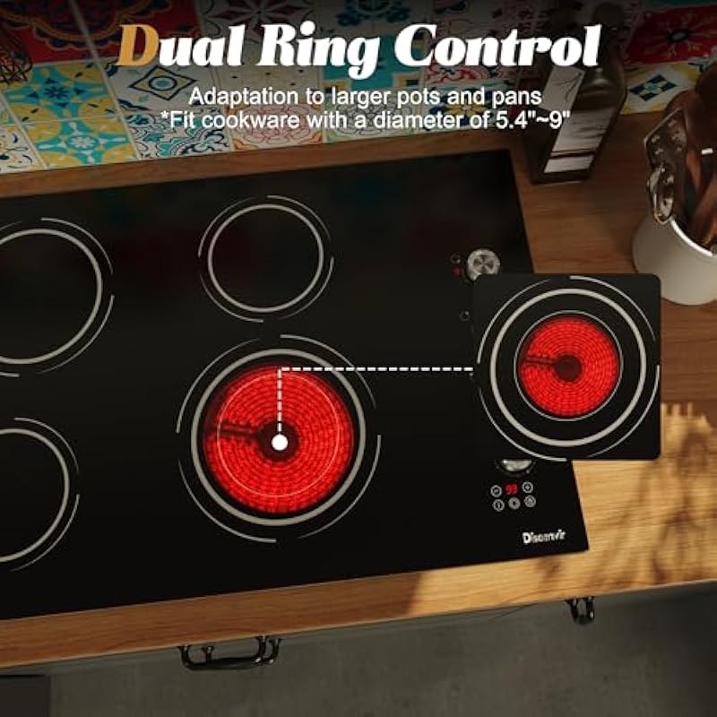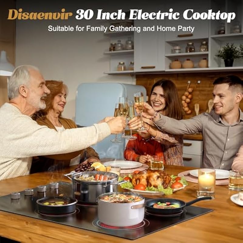 - đăSafety Features for Peace of MindăThis 4 burner electric cooktop 30 in is equipped with various safety features to ensure a secure cooking experience. The sensor touch controls offer a safety lock function, preventing accidental activation and keeping your children safe in the kitchen. Disaenvir cooktop also features residual heat indicators that alert you when the surface is still hot, reducing the risk of burns or accidents. Besides, automatic shut-off function is included in case you forget to turn off the electric stovetop.