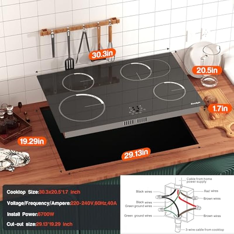 - 🐣【220-240v 6700W High Power】This 30 inch electric cooktop is suitable for AC220-240V, featuring 4 different cooking zones with total power 6700W. The top left 6.5″(165mm) round cooking zone has a maximum 1200W power; the lower left 9.1″(230mm) zones have a maximum 2300W power; the top right 6.5″(165mm) round cooking zone and 10.6″(270mm) oval zone have a maximum 1100W and 2000W power respectively; The lower right 6.5″(165mm) round cooking zone has a maximum 1200W power. Built-in Ceramic Hob 220-240v hard wired, need a professional electrician for wiring.