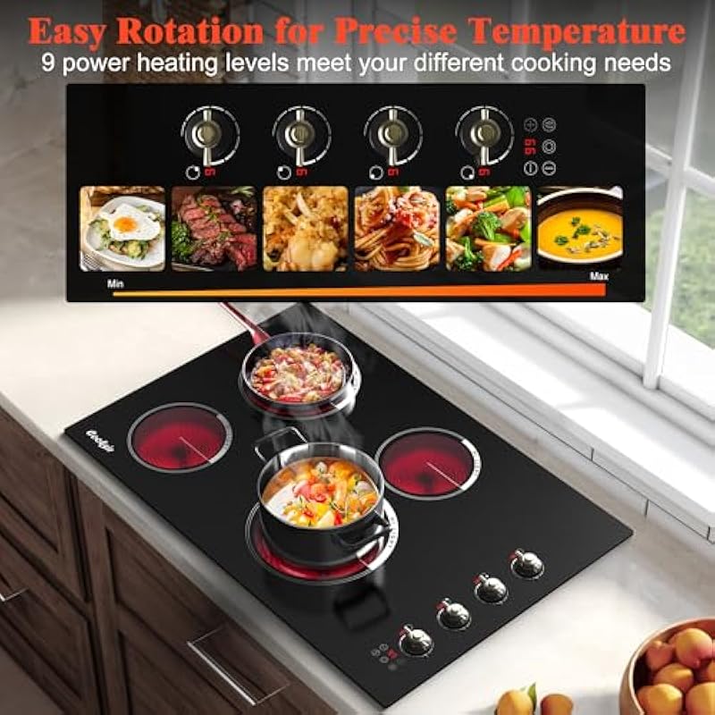 - âĄă9 Power Heating Levelsă9 Power Levels, making you greater control over Cooking Temperature with the powerful 6700W, meet all your needs of delicate heating accuracy. With Cooksir large electric stove top, you can control the temperatures more precisely than gas or induction. This better temperature control delivers consistent results, reducing the risk of over or under cooking.