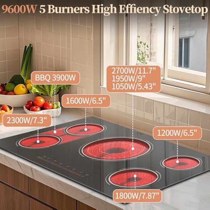 - 🐹| Safety Lock and Overheat Indicator | Safety is a top priority with this 5 burner electric cooktop, which includes a safety lock feature to prevent accidental activation, making it an excellent choice for households with children and pets. Additionally, the overheat indicator alerts you when the cooktop surface reaches excessively high temperatures. So please do not touch the glass in this time.