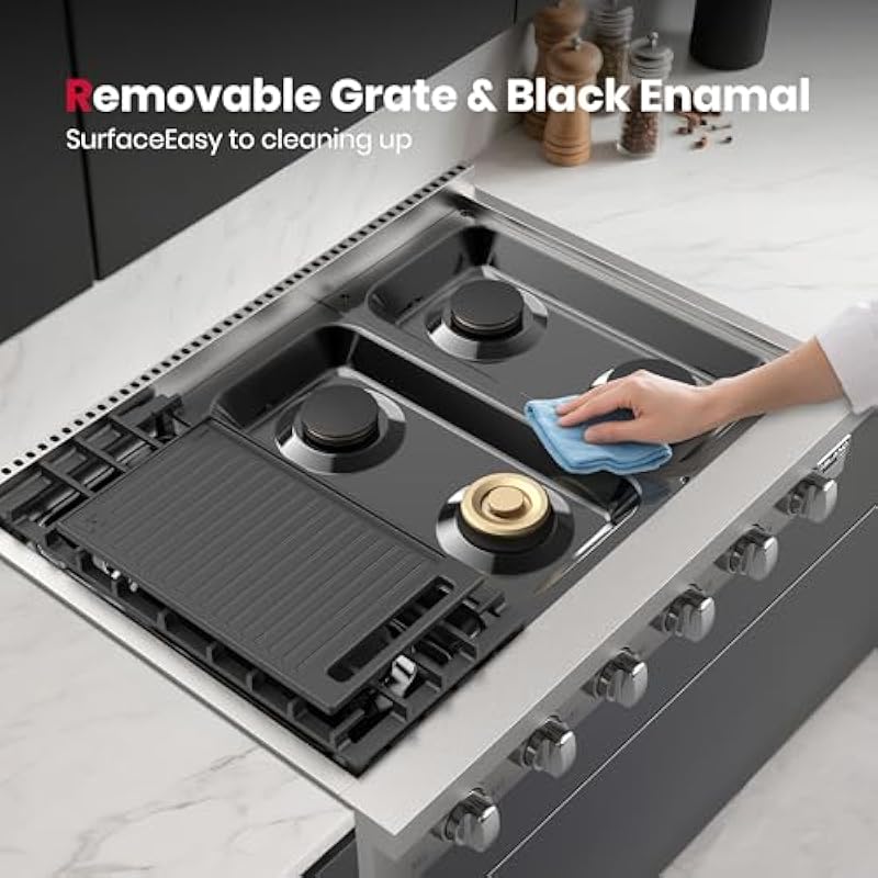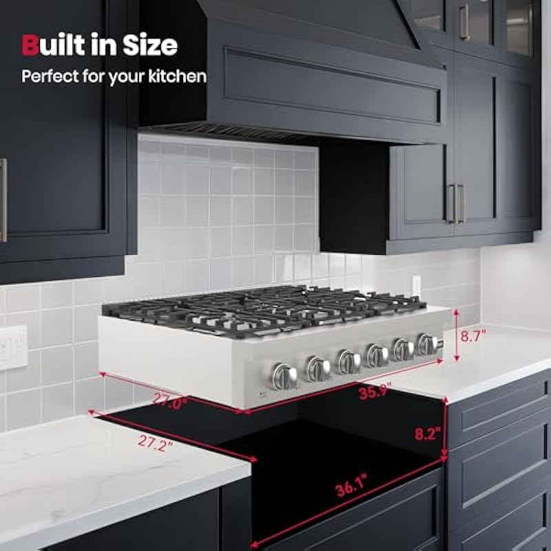 - 【Dimension】Product size: 35.9 in. W x 26.5 in. D x 8. 7 in. H. Cut out size: 36.1 in. W x 26.5 in. D x 7.5 in. H.Pre-installed for natural gas (gas regulator included), can be converted to liquid propane gas use (LPG conversion kit not included). Pre-installed US standard 120v GFCI power cord plug(electric ignitor), 15 amps breaker required.