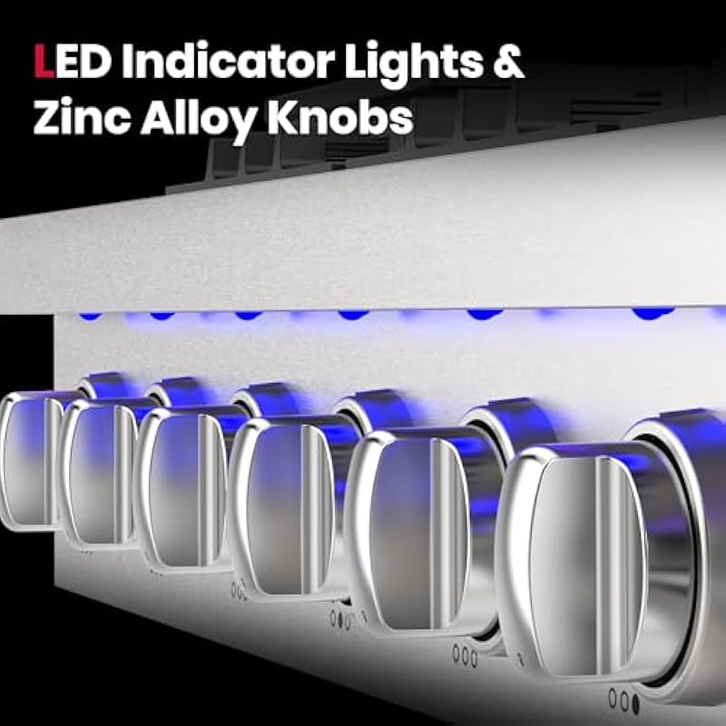- 【Blue Indicator Lights】Blue LED lights accent the control panel and illuminate knobs that allows you to see if the cooktop is turn on from a distance.