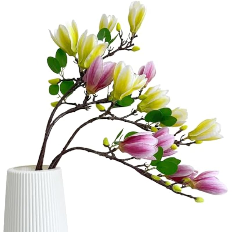 - Artificial flower stems:This white faux magnolia flowers has branch shapes,bright colors,and shrub flower designs,making the realistic artificial flowers look real and attractive. Due to its long handle,long stem artificial flowers easily fits most sizes of tall flower vases and is very suitable for flower arrangement.Due to long-distance transportation, some leaves and petals may be slightly bent. You can gently flatten them using a low-temperature hairdryer.