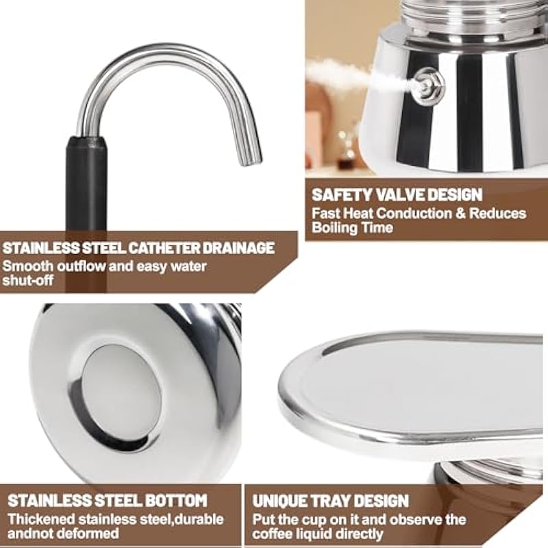 - Catheter Drainage Design: Compared with traditional moka pots, this moka pot eliminates the step of pouring coffee. You only need to put the cup on the tray and wait for the coffee to flow out