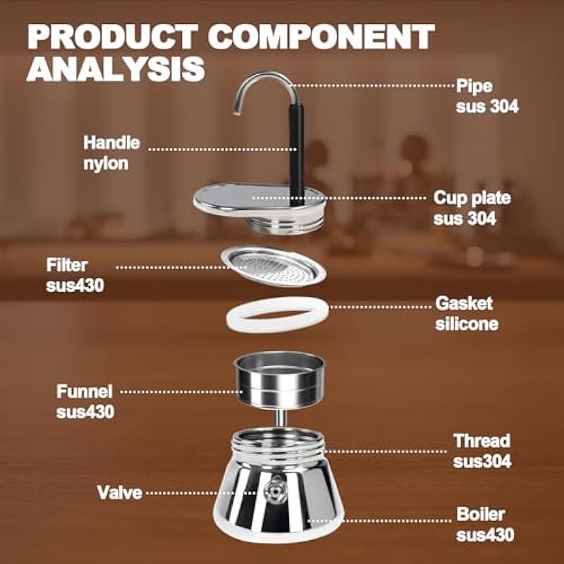 - Easy to Use: When you use it for the first time, the coffee pot may emit an unpleasant odor, please don’t worry too much, it’s normal. Please add tea, oranges, detergent or other items to remove the odor and wash it several times before use. Fill the lower part of the espresso maker with water, put the ground coffee into the funnel, put the lid on, and put the espresso maker on the stovetop to brew for 3-8 minutes. After using the stovetop espresso maker, rinse it well with water