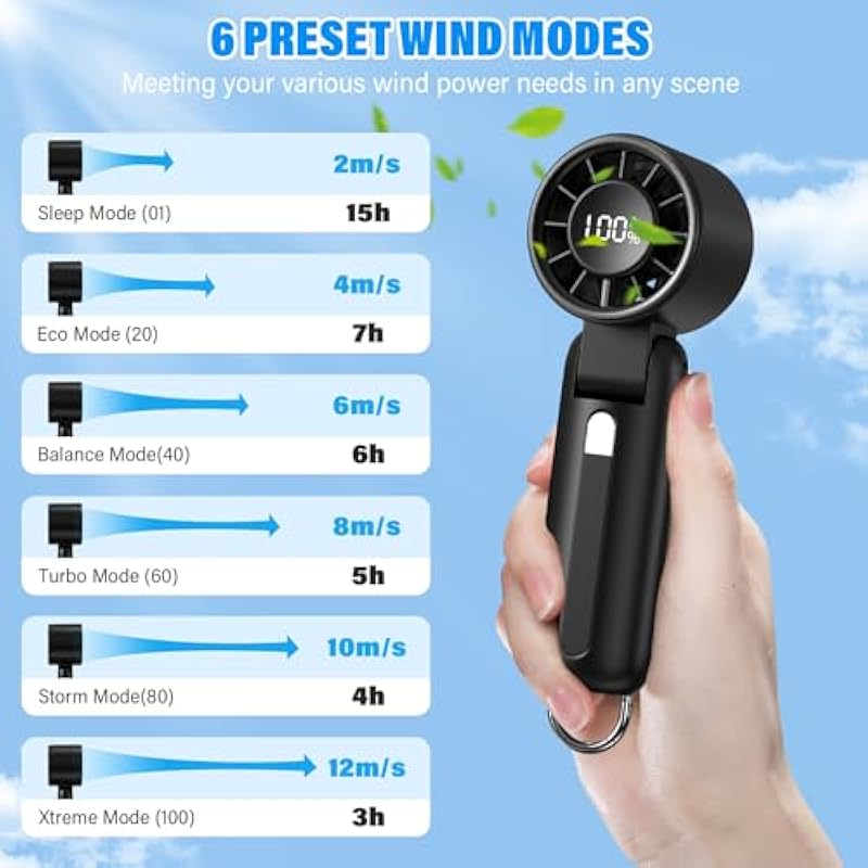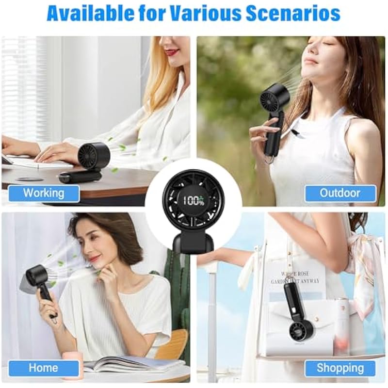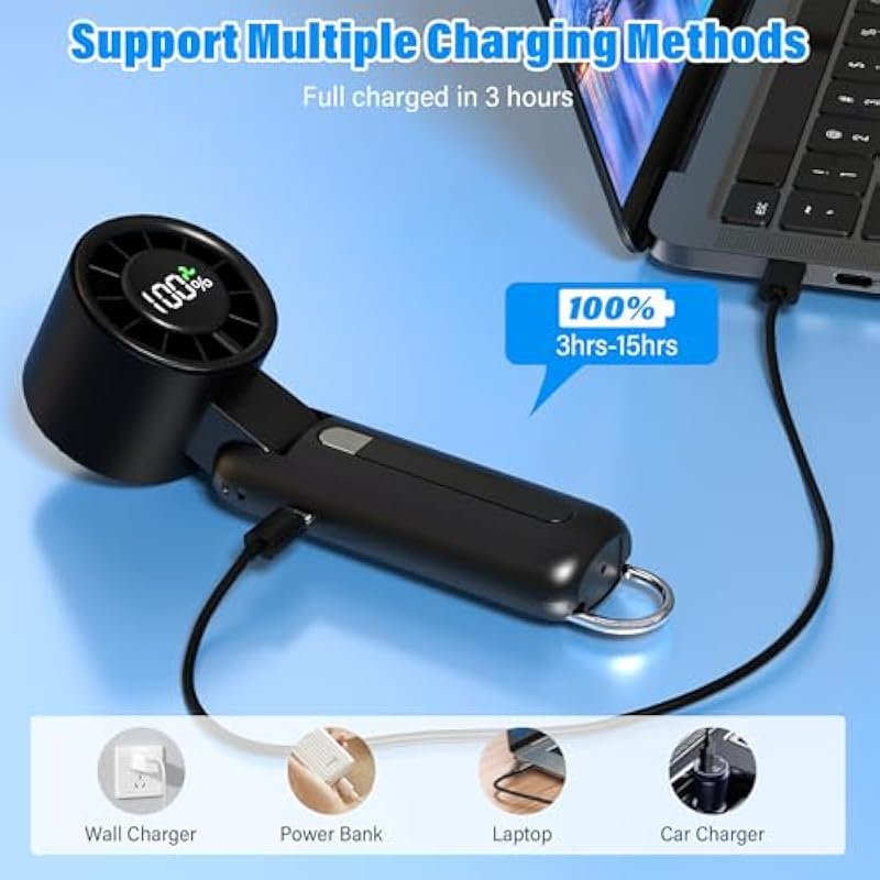 4 in 1 Turbo Handheld Fan – 100-Speed Adjustable, 160° Flexible Head, 5000mAh Battery, 7-Blade Cooling – Portable, Foldable & Carabiner Clip for Travel, Office, Camping (Black)