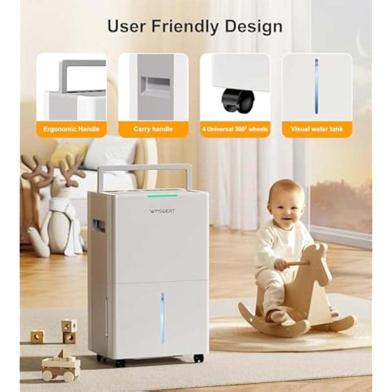 - Easy-Move Portable Design, Weighs Only 27 lbs: Move it effortlessly anywhere! This compact unit (13″×9″×20″) features 360° wheels and sturdy handles. Easily transport it from the basement in the morning to the bedroom at night for whole-home humidity control on your terms.