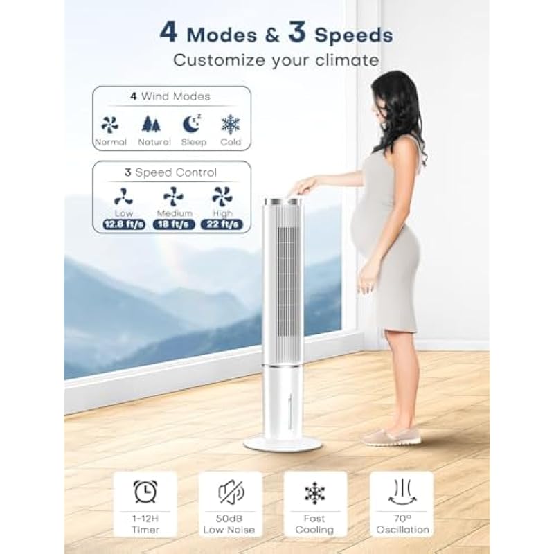 - 【4 Modes & 3 Speeds for Customizing Your Cilmate】With 3 wind speeds (low-13ft/s, medium-18ft/s, and high-22ft/s), our evaporative air cooler delivers an airflow distance at up to 22 ft/s.