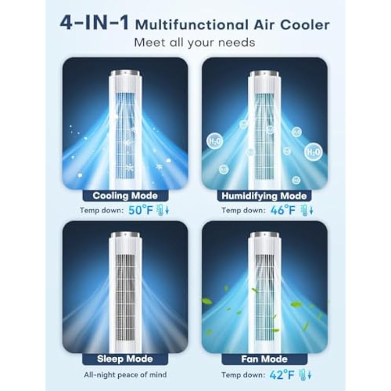 - 【3 IN 1 as Fan, Air Cooler & Humidifier 】This air cooler for room works as a fan, humidifier, and air cooler in a sleek design. 1) Fan: Delivers powerful airflow for ventilation. 2) Humidifier (add water); 3) Air Cooler (add water and ice packs).