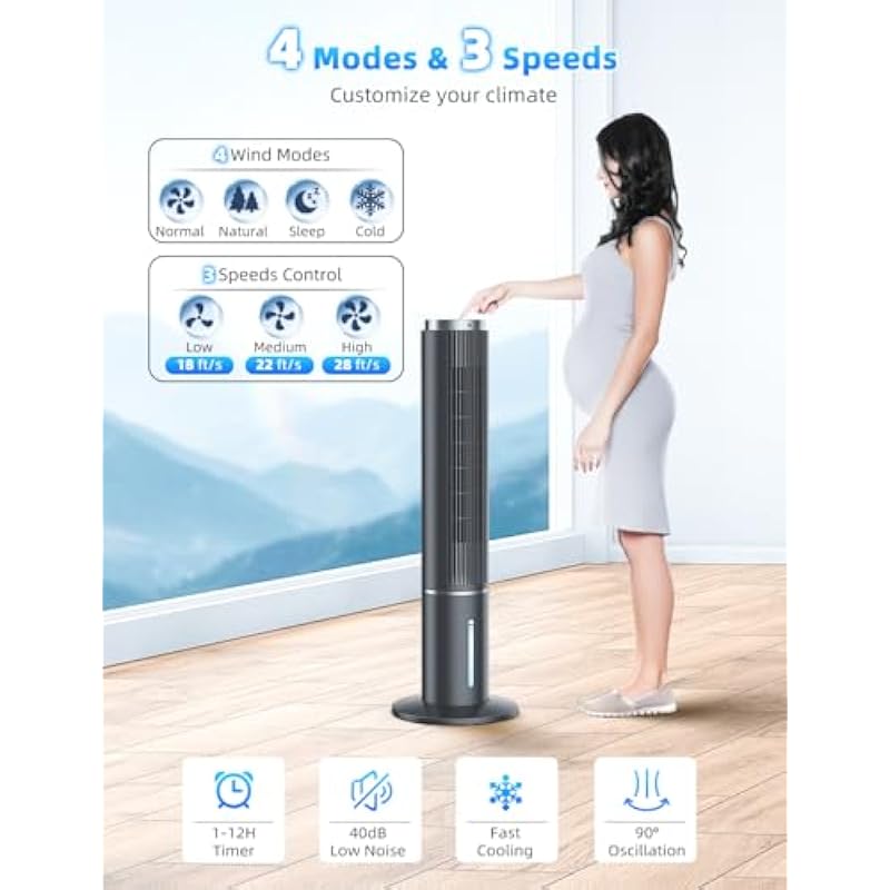 | Special Feature | 1 Gallon Water Tank & & Removable Washable Filter & Low Water Indicator & 5.9 Feet Power Cord & & 4 Ice Packs, 12H Timer for Smart Auto Shut-Off & 50dB Low Noise & Touch Panel & 20ft Remote Control, 28 FT/S Max Speed & 300 Sq. Ft Max Coverage Area & Evaporation Capacity: 0.5L/H, 3 Wind Speeds (L/W/H) & 4 Modes (Normal/Natural/Sleep/Cooling) & 80W Energy-Saving & UL Listed & Fast Cooling, Built-in Handle & Safe Bladeless Designs & 42 Inch Height & 90ยฐ Oscillation & Anti-dumping Base |