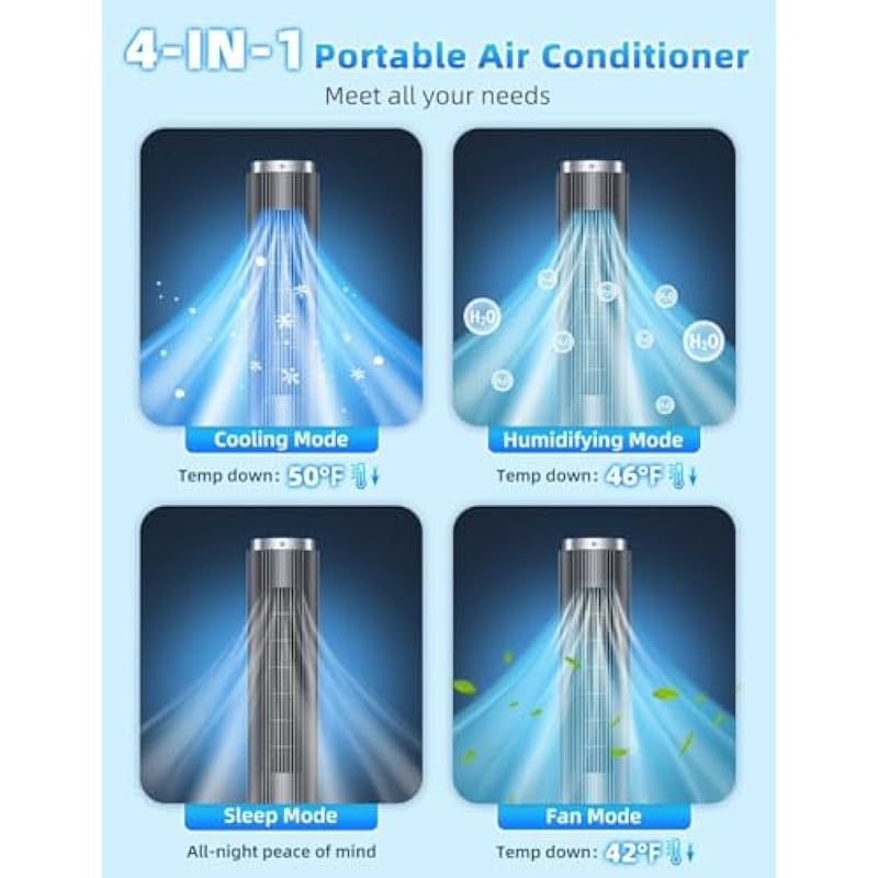 42 INCH Windowless Portable Air Conditioners w/4 Modes & 3 Speeds, 1-Gal Tank for 15H Cooling, 12H Timer, Swamp Cooler Air Conditioner No Window Needed, 90ยฐ Oscillating AC Unit for Bedroom