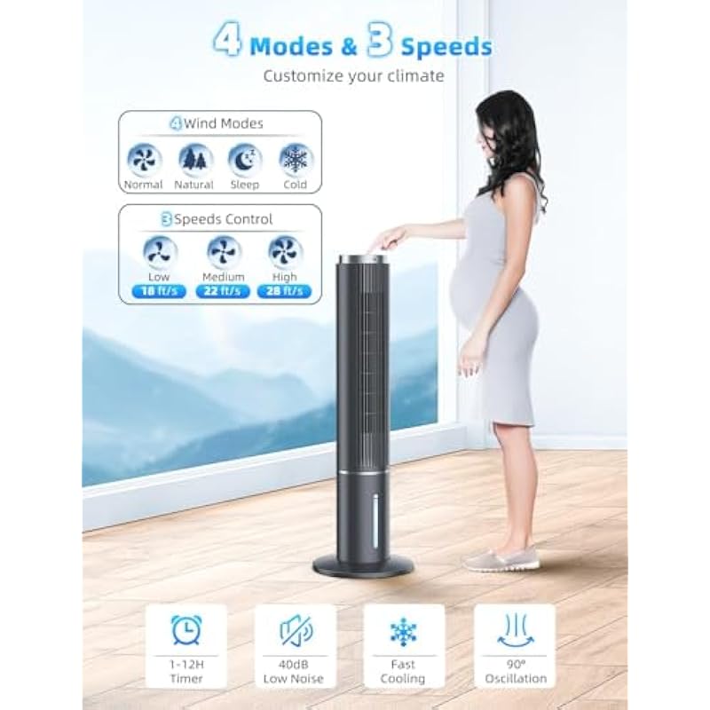 | Special Feature | โ1 Gallon Water Tank & & Removable Washable Filter & Low Water Indicator & 5.9 Feet Power Cord & & 4 Ice Packs, 12H Timer for Smart Auto Shut-Off & 50dB Low Noise & Touch Panel & 20ft Remote Control, 28 FT/S Max Speed & 300 Sq. Ft Max Coverage Area & Evaporation Capacity: 0.5L/H, 3 Wind Speeds (L/W/H) & 4 Modes (Normal/Natural/Sleep/Cooling) & 80W Energy-Saving & UL Listed & Fast Cooling, Built-in Handle & Safe Bladeless Designs & 42 Inch Height & 90ยฐ Oscillation & Anti-dumping Base |