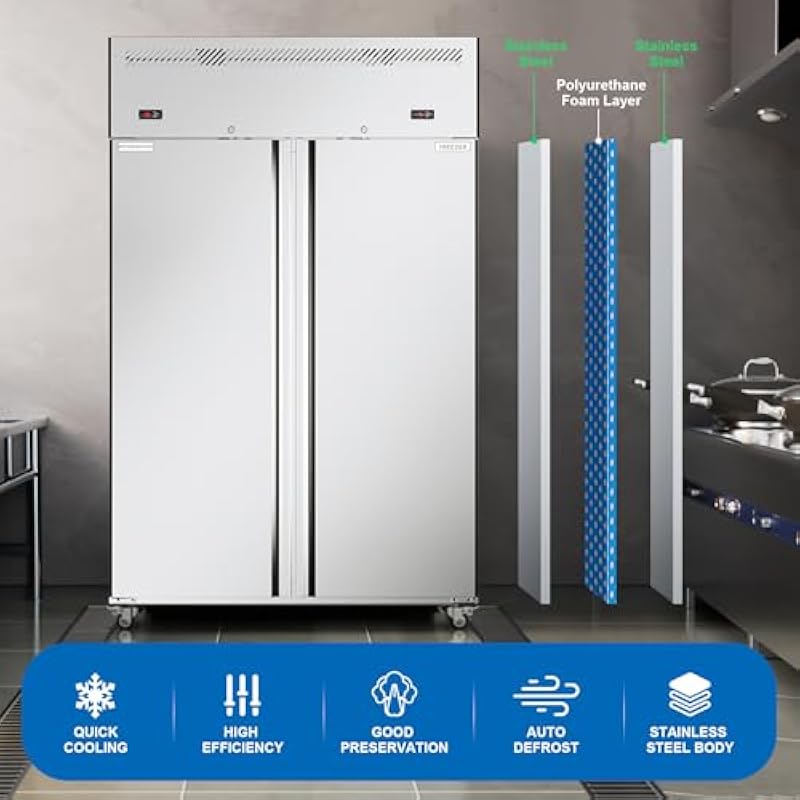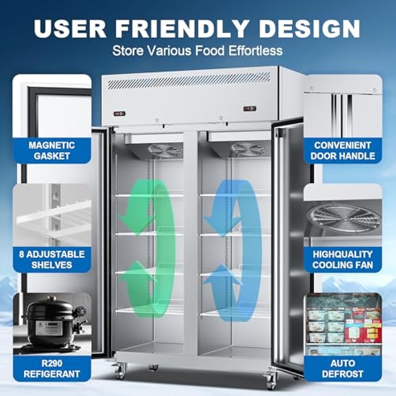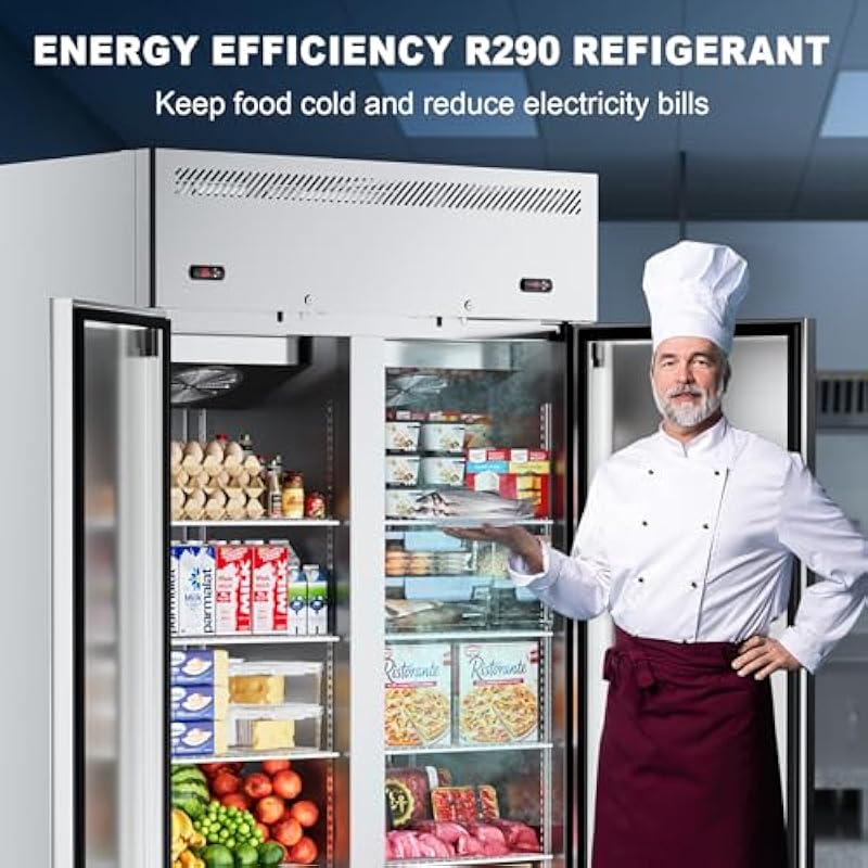 - Commercial refrigerator and freezer combo utilizes R290 refrigerant and an efficient compressor for optimal cooling. It minimizes energy expenses while maintaining the freshness of food through a fan cooling system that prevents frost and ensures uniform cooling.