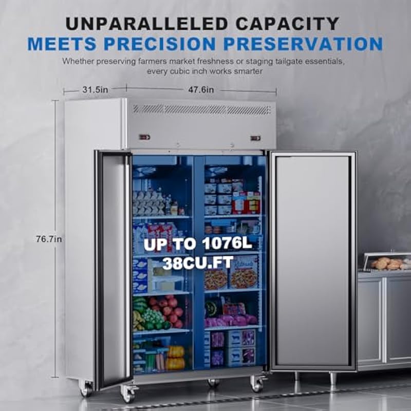 - ECEVT commercial refrigerator freezer combo has 8 shelves, each able to hold up to 180lbs, and provides a storage space of 38 cubic feet. With its ample space, this commercial freezer is perfect for storing food items and handling high-demand services.