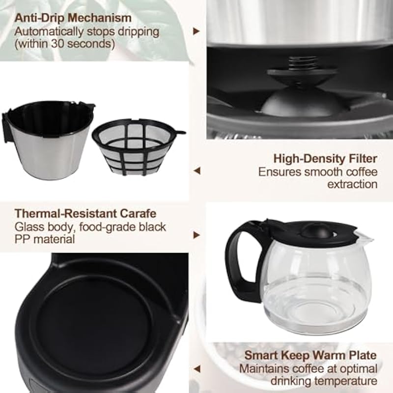 - 10 Cup Capacity: Ideal for gatherings, effortlessly brews approximately 5 cups of coffee at once to satisfy family breakfasts, friend get-togethers, or weekend parties. One drip coffee maker is sufficient, eliminating the hassle of repeated brewing. Host every guest with ease and enjoy uninterrupted coffee moments