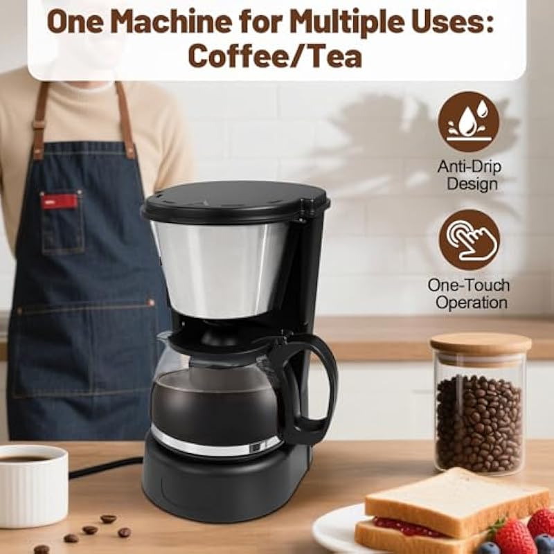 5 Cup Drip Coffee Maker One-Touch Anti-Drip Coffee Machine with Reusable Filter Carafe Auto Keep Warm Plate Spoon Coffee Pot Suitable for Home Use 110V