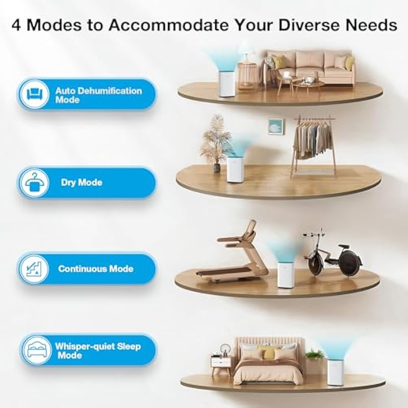 - Smart Modes for Customized Comfort: This home dehumidifier offers 4 versatile modes to meet your specific needs. DEHU maintains ideal humidity for health, Turbo DRY accelerates laundry drying by 40%, CONT battles persistent dampness in wet areas, while Night Mode operates at a library-quiet 32dB with auto-dimming display. Tailor humidity room-by-room for precision comfort—exactly where you need it.